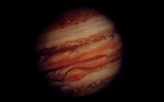 Colorful latitudinal bands, atmospheric clouds and storms illustrate Jupiter's dynamic weather systems. The cloud patterns change within hours or days. The Great Red Spot is a complex storm moving in a counter-clockwise direction. At the outer edge, material appears to rotate in four to six days; near the center, motions are small and nearly random in direction. An array of other smaller storms and eddies can be found through out the banded clouds.